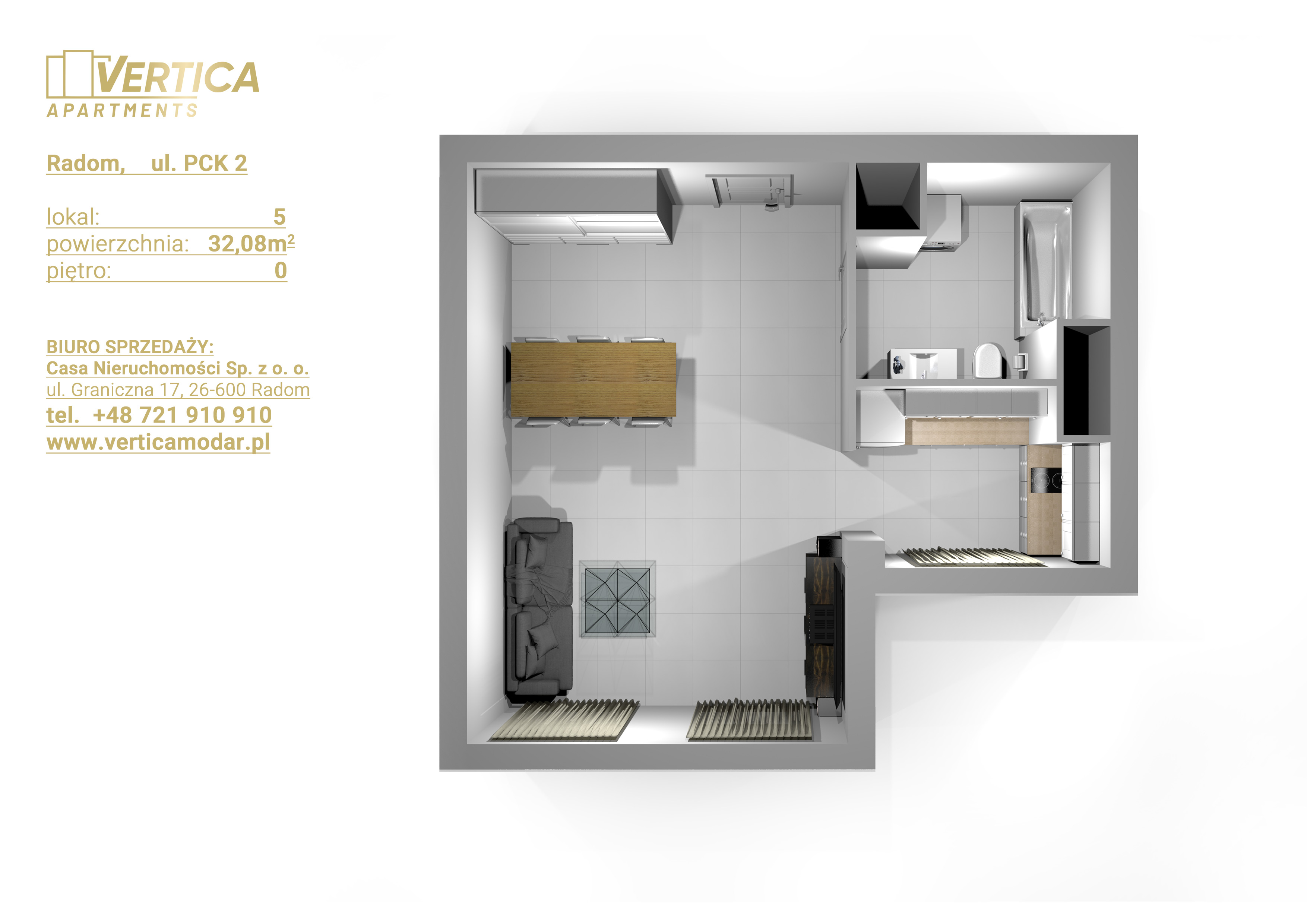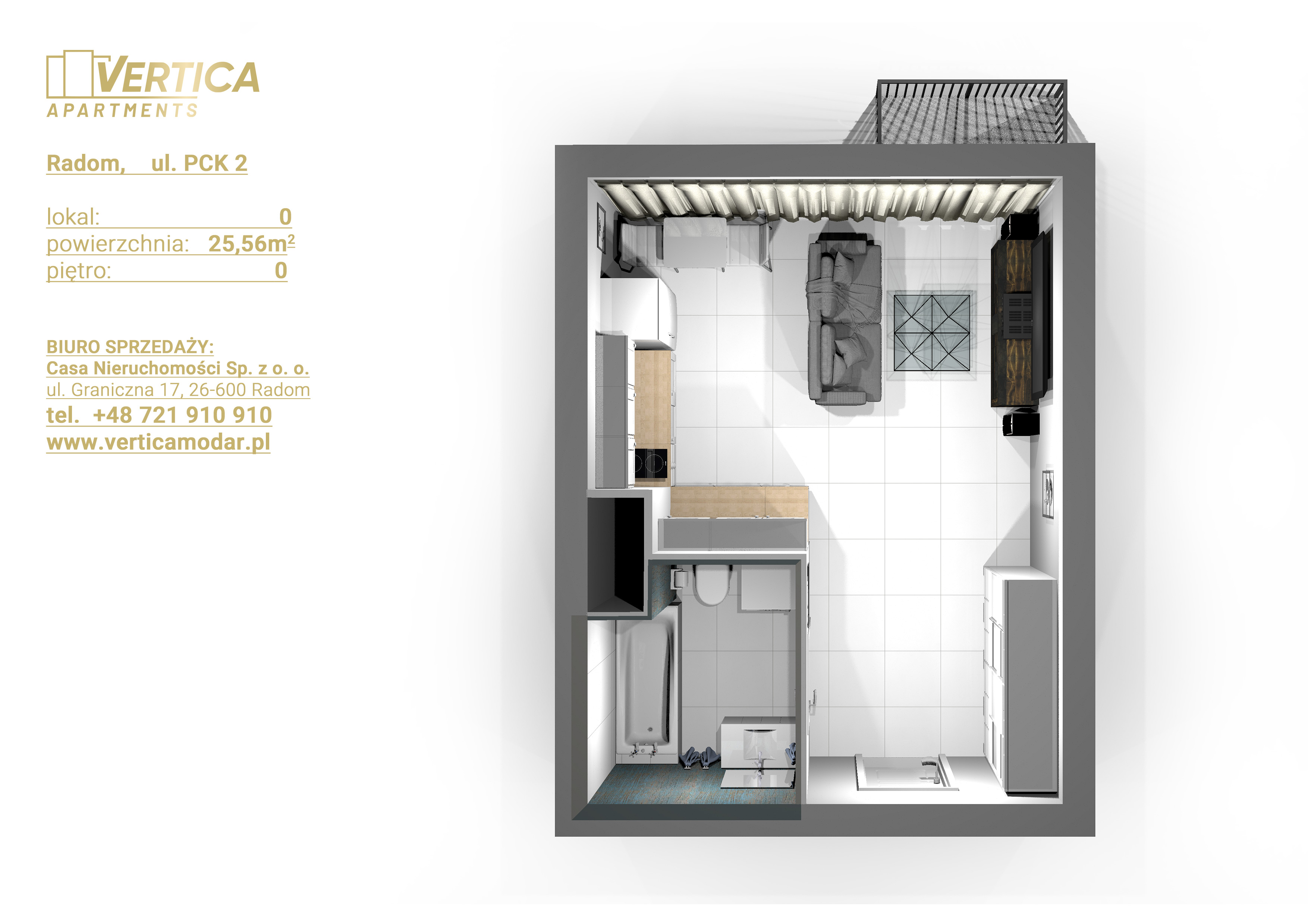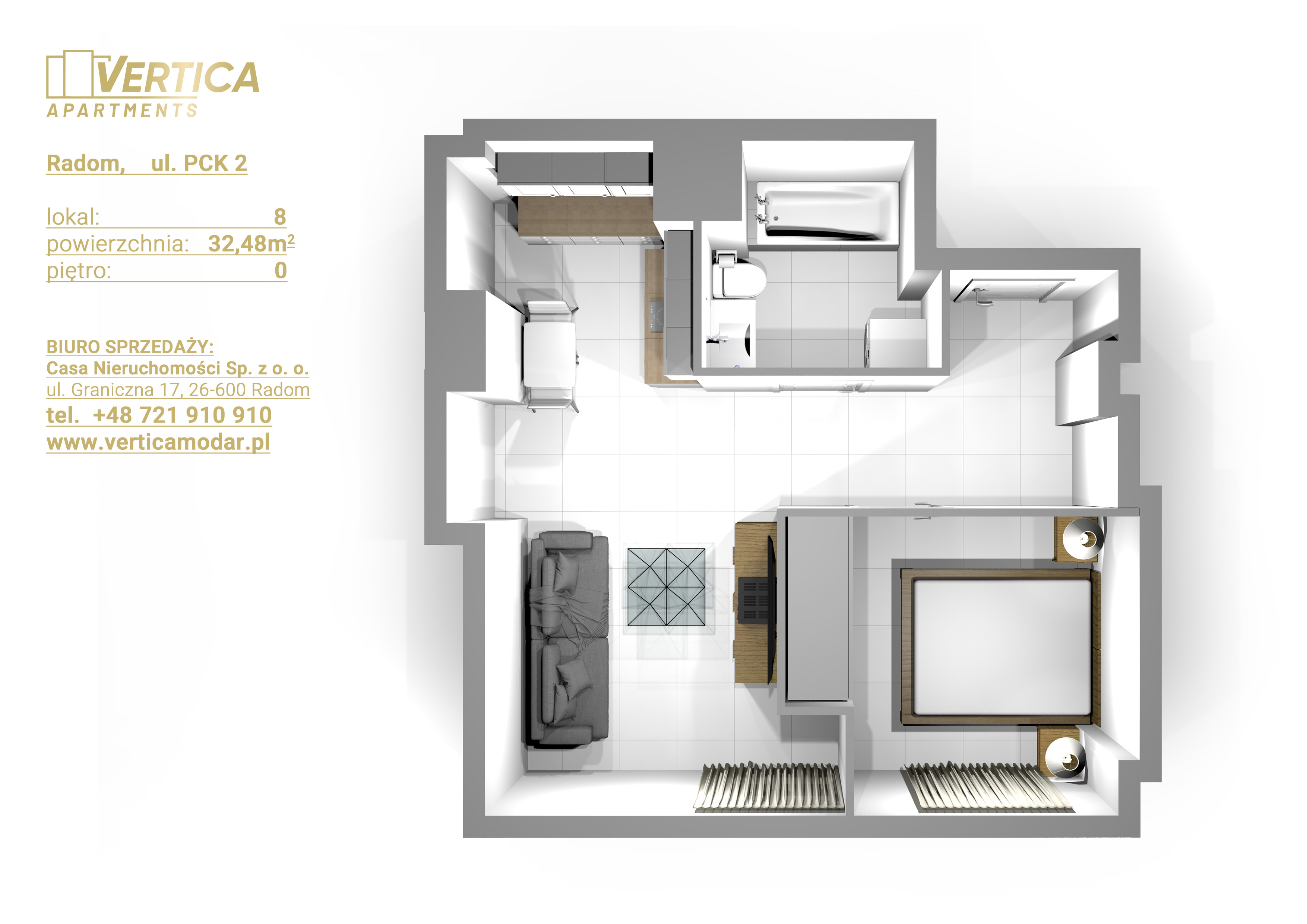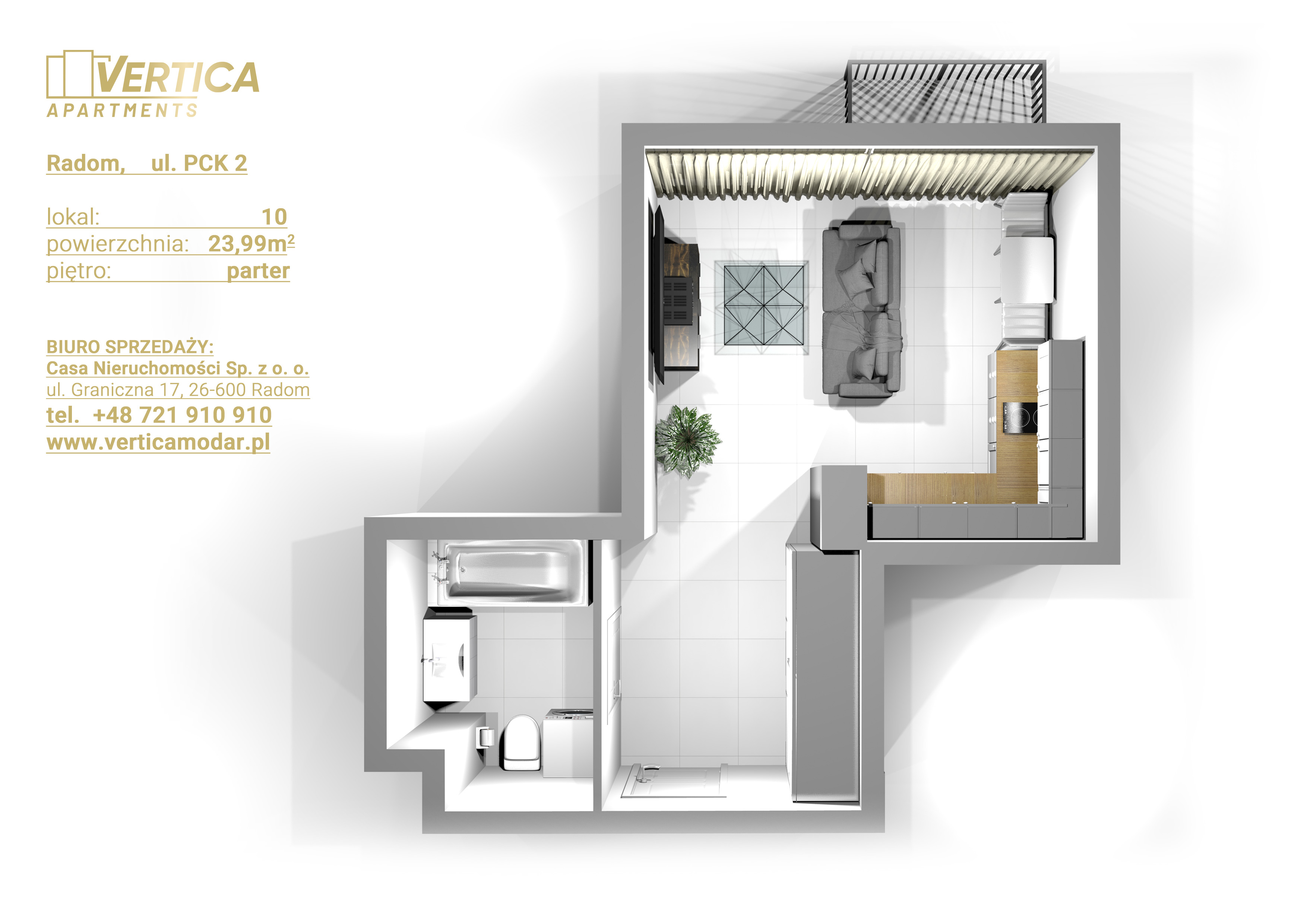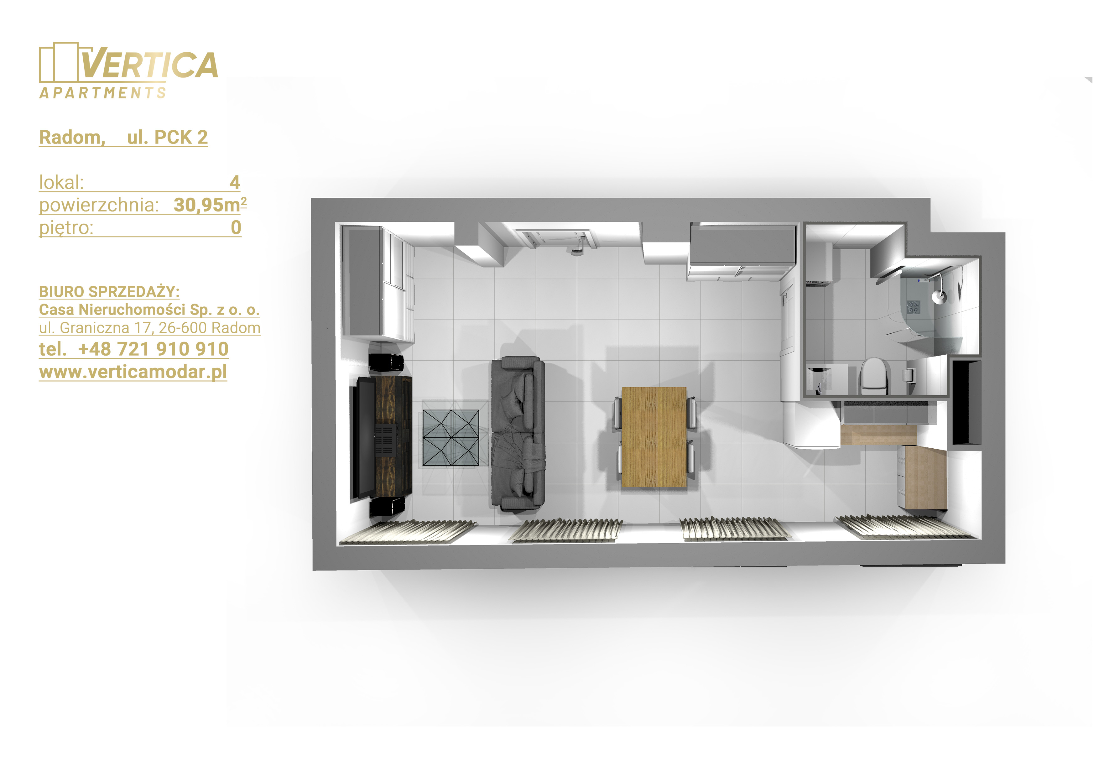 Inwestycja realizowana jest przy ul. PCK w Radomiu. Budynek będzie posiadał 4 kondygnacje naziemne. Na parterze będą usytuowane lokale usługowe a na 1, 2, 3 piętrze apartamenty pod wynajem – każdy na sprzedaż.