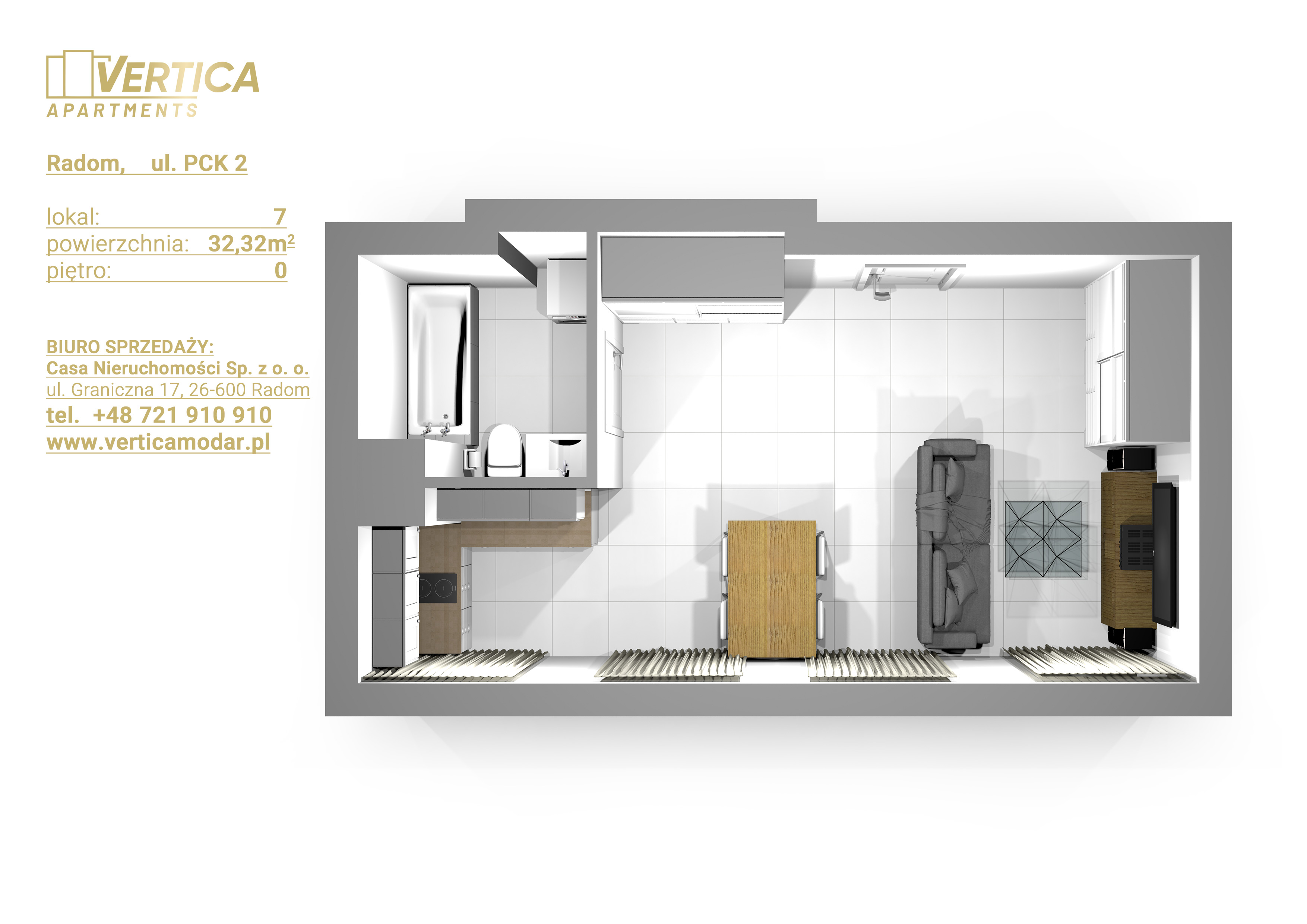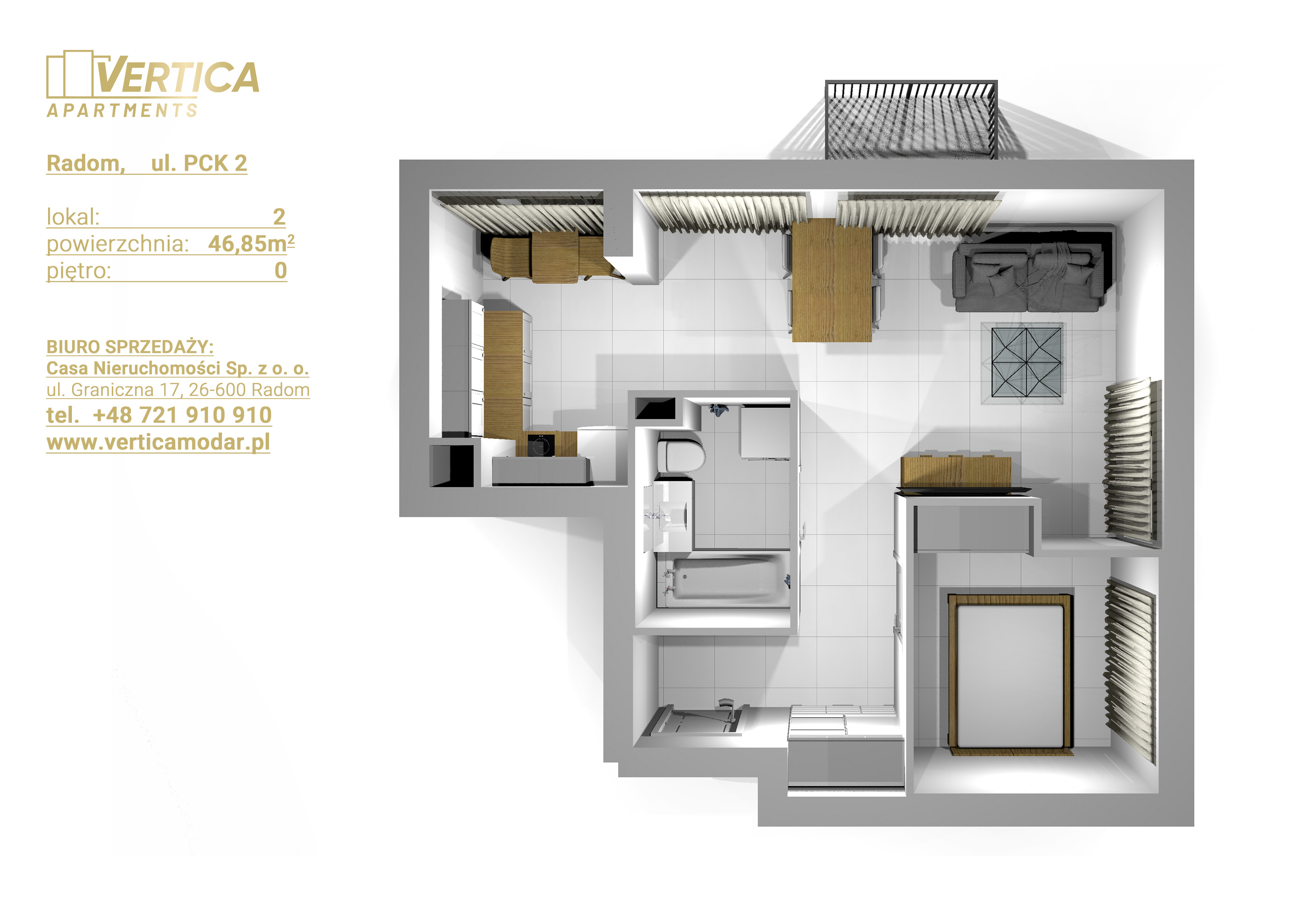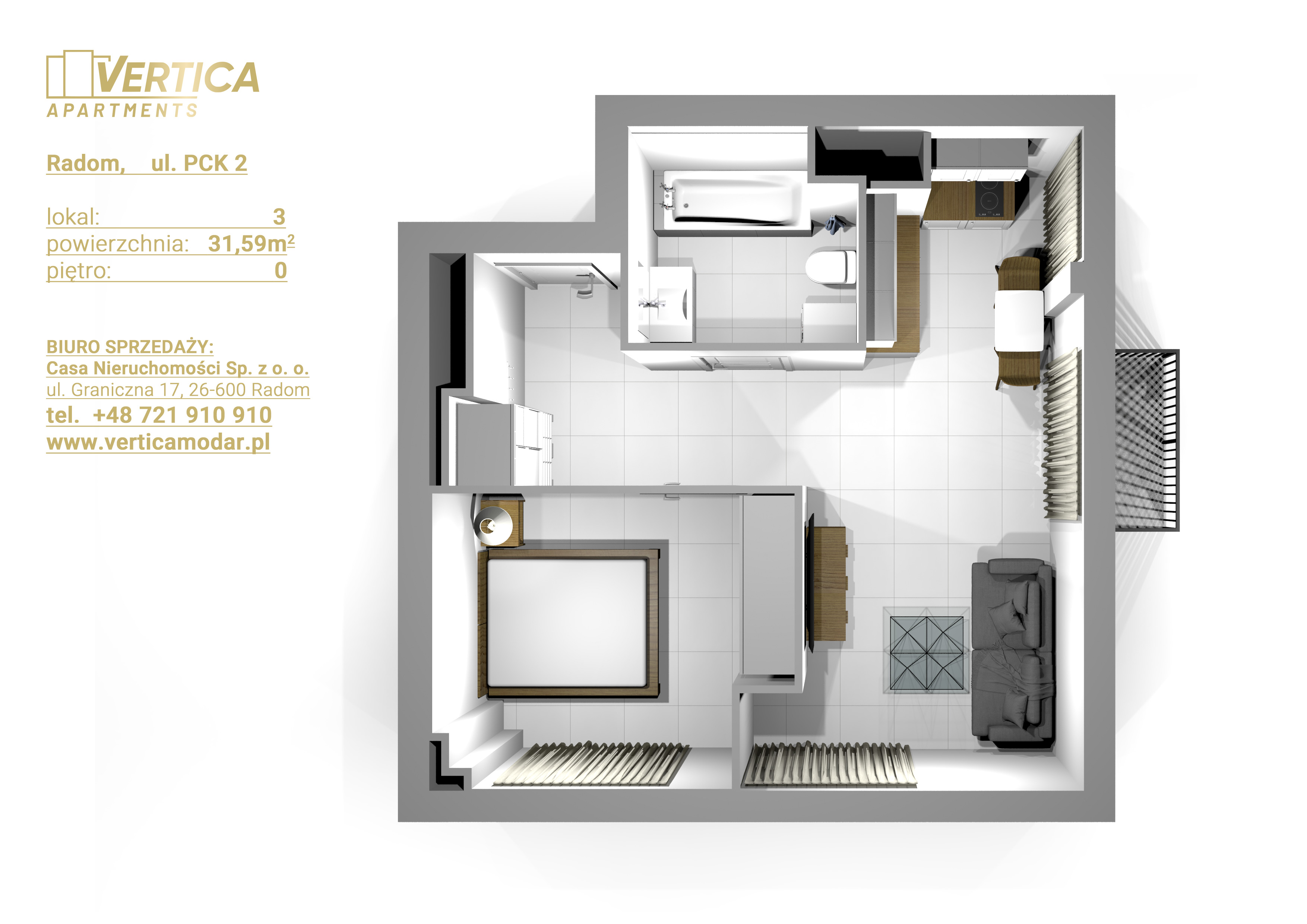 Inwestycja realizowana jest przy ul. PCK w Radomiu. Budynek będzie posiadał 4 kondygnacje naziemne. Na parterze będą usytuowane lokale usługowe a na 1, 2, 3 piętrze apartamenty pod wynajem – każdy na sprzedaż.
